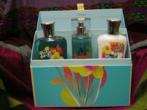 Perfume, shower gel and body lotion in "wild apple daffodil" scent.